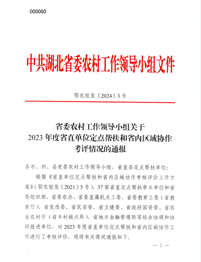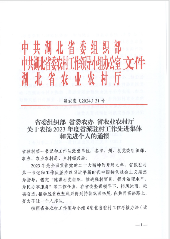 同时,省农业农村厅印发的省委组织部、省委农办、省农业农村厅《关于表扬2023年度省派驻村工作先进集体和先进个人的通报》(鄂农发[2024]21号),玩球通平台荣获“2023年度工作突出派出单位”。