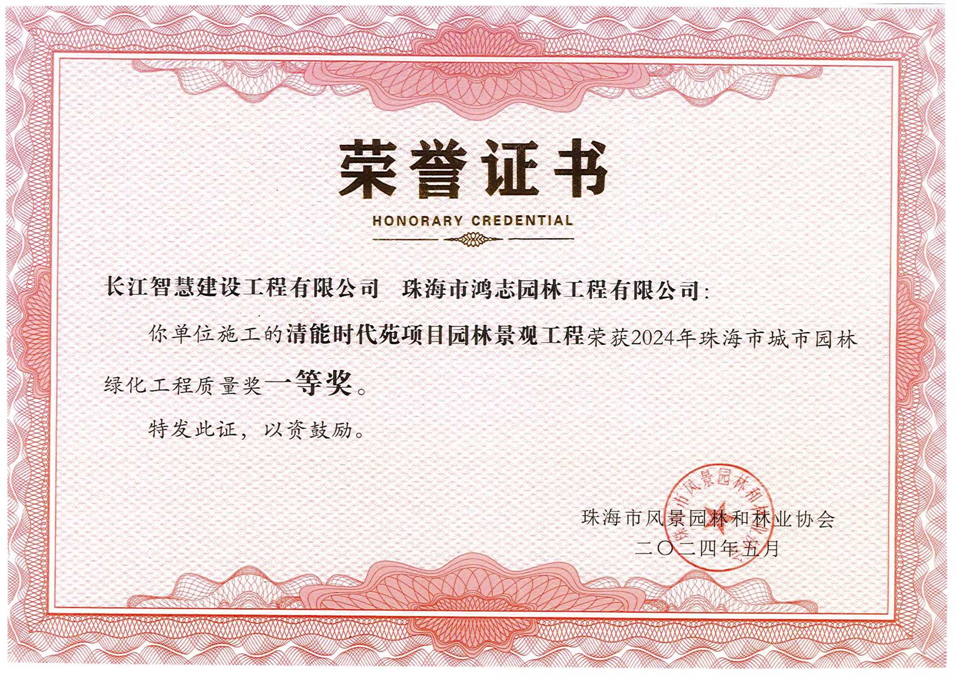 珠海市城市园林绿化工程质量奖一等奖